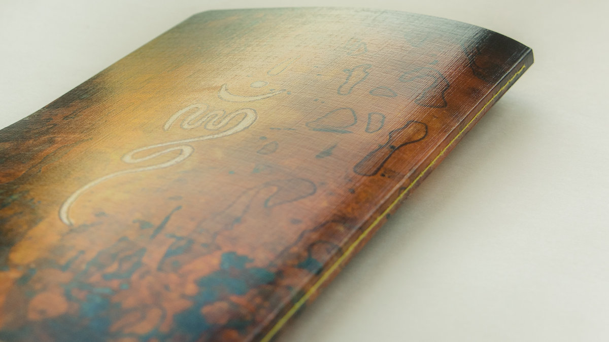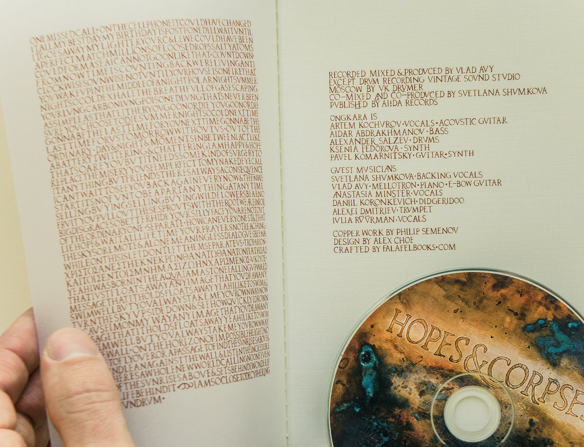 Sketchbook / notebook designed by Ongkara. Includes full lyrics that come on 2 pages of tracing pater which are more like a conundrum to decipher (unique latin-style H&C lettering, no spaces, no punctuation marks, none of that nonsense), info about makers and audio CD.